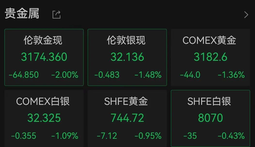 截至22:34,现货黄金持续跳水,跌2%,报3174美元/盎司。COMEX黄金跌1.36%,报3182美元/盎司。